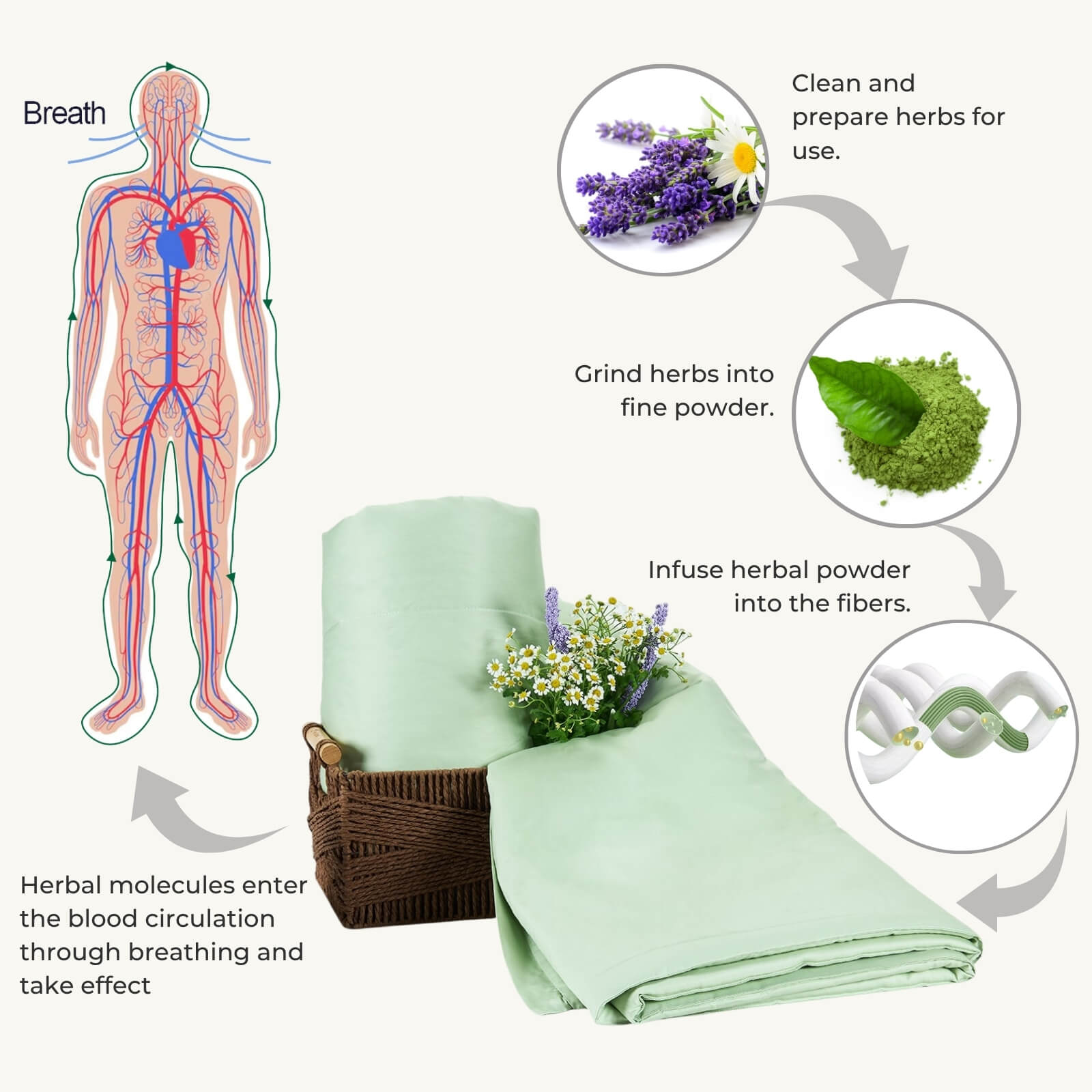 The HerbalRX™ technology works through two scientifically-backed mechanisms: First, herbal molecules are released through green breathing therapy—you inhale them naturally through your nose, mouth, and skin throughout the night. Second, the quilt's far-infrared radiation resonates at the same frequency as human blood cells, enhancing cellular absorption of these beneficial compounds. This dual-action approach helps you fall asleep faster, achieve deeper REM sleep, and wake feeling refreshed without the side effects of sleeping pills.