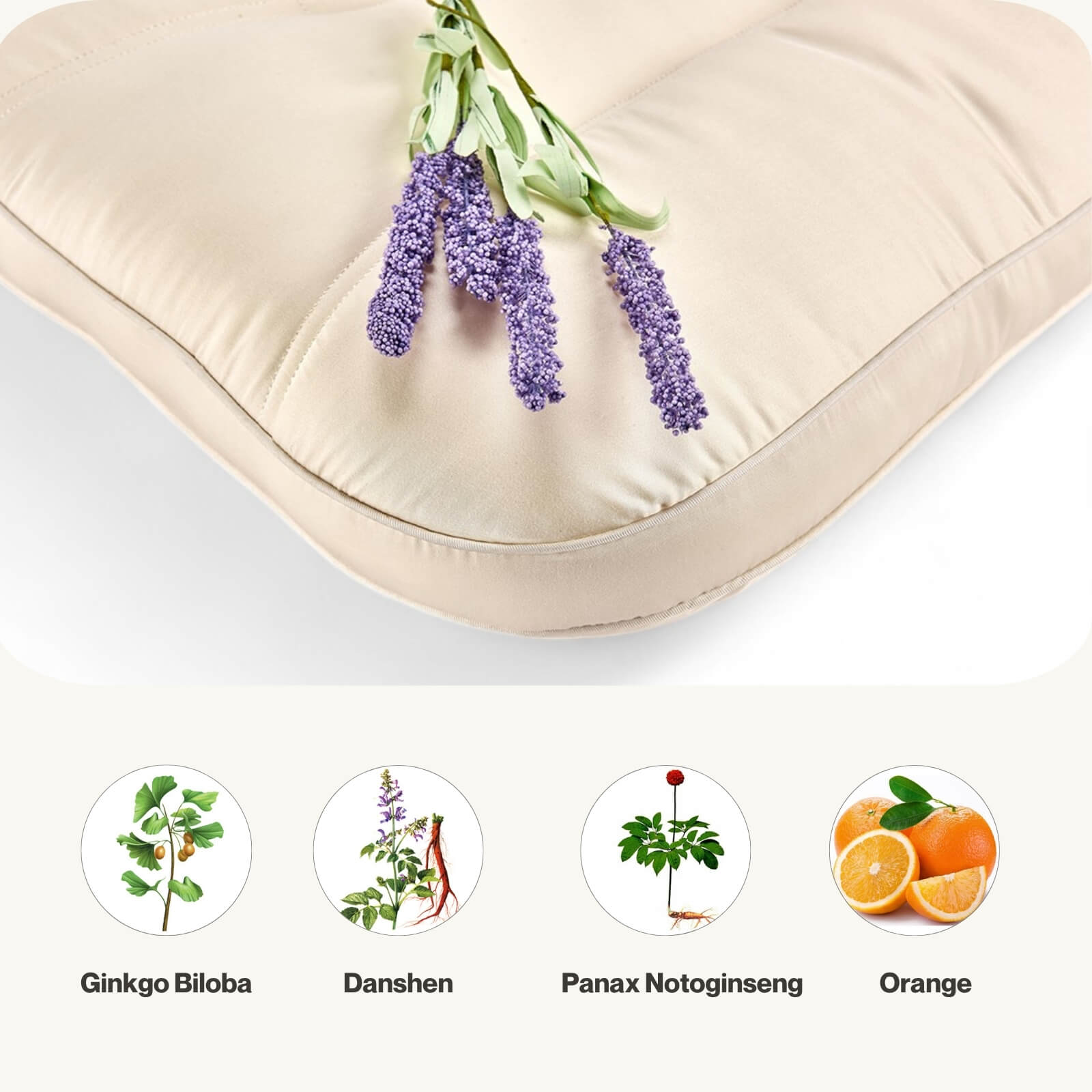 No. The herbal ingredients are expertly integrated into the fiber at a molecular level, not stuffed in as dried herbs or sachets. This means you won't feel any lumps, bumps, or scratchy plant material. Therefore, there will be no herbal odor. Only when you rub the fibers of the pillow's inner core with your hands will a faint herbal fragrance remain on your fingers.