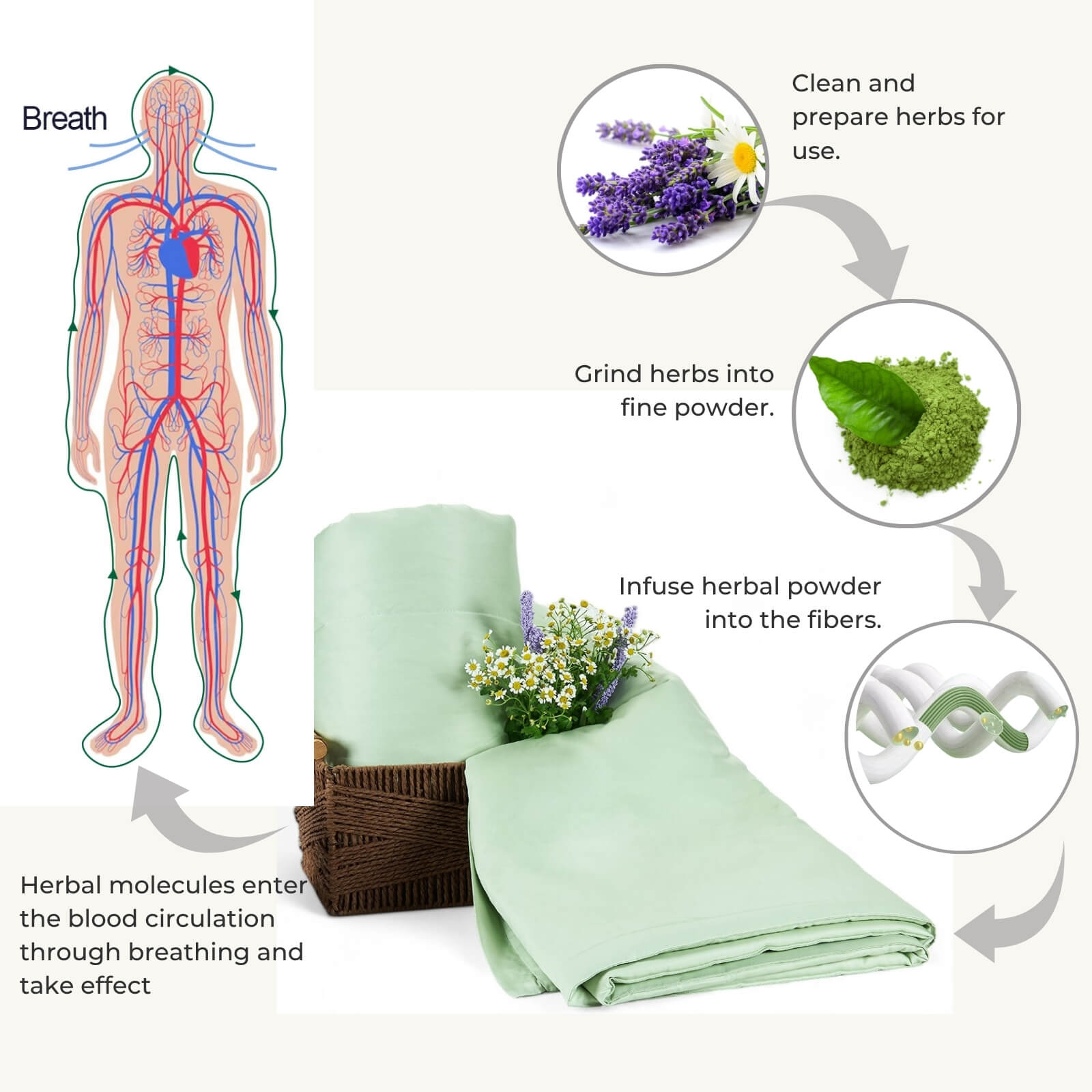 The HerbalRX™ technology works through two scientifically-backed mechanisms: First, herbal molecules are released through green breathing therapy—you inhale them naturally through your nose, mouth, and skin throughout the night. Second, the quilt's far-infrared radiation resonates at the same frequency as human blood cells, enhancing cellular absorption of these beneficial compounds. This dual-action approach helps you fall asleep faster, achieve deeper REM sleep, and wake feeling refreshed without the side effects of sleeping pills.